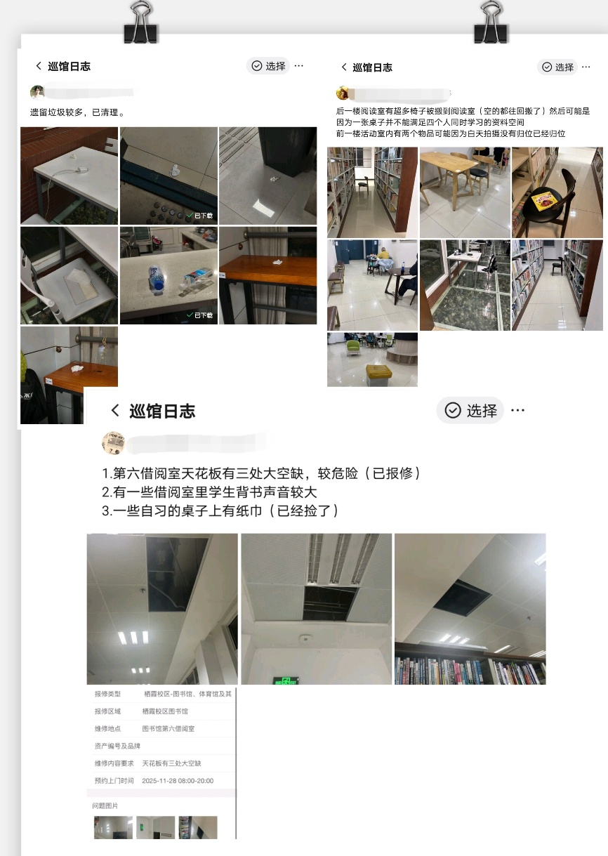 助理小馆员们不仅是秩序的维护者、安全的巡查员,更是图书馆服务的延伸者。每晚八点半,他们准时到岗,身影穿梭于各楼层之间:面对喧哗、占座等行为,他们礼貌提醒、耐心劝导,共同守护馆内宁静与秩序;发现设备故障、照明异常等问题,他们第一时间记录上报,联系跟进,全力保障各项设施的正常运转。